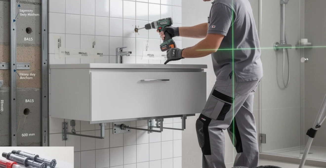 ements sanitaires commence par le relevé précis des caractéristiques du meuble de salle de bain suspendu. Un meuble simple vasque de 100 à 120 cm pèse généralement entre 35 et 50 kg vide, tandis qu’un meuble double vasque peut atteindre 60 à 80 kg selon le matériau (MDF, bois massif, métal). À cela s’ajoute le poids de la ou des vasques : une vasque céramique peut peser de 15 à 25 kg, une vasque en pierre naturelle jusqu’à 40 ou 50 kg.
