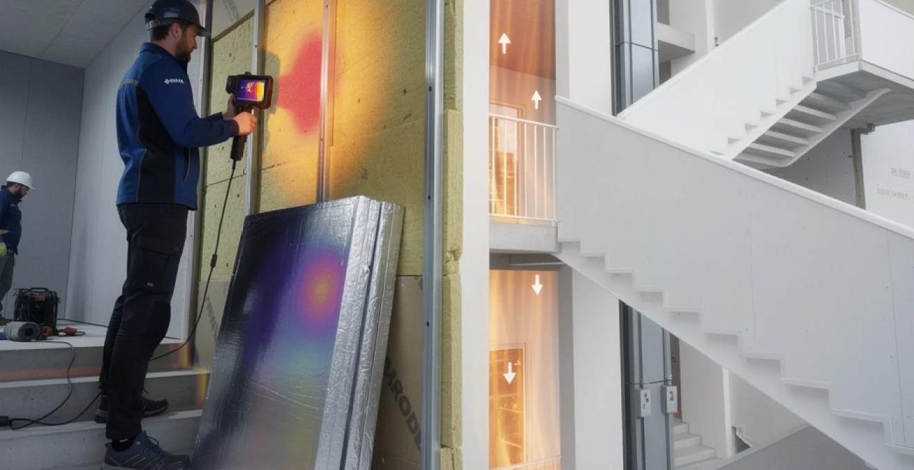 La thermographie infrarouge représente aujourd’hui l’outil de référence pour visualiser les défauts d’isolation dans les volumes verticaux complexes. La caméra thermique FLIR E8-XT, avec sa résolution de 320 × 240 pixels et sa sensibilité thermique de moins de 0,06°C, permet de détecter les variations de température les plus subtiles sur les parois des cages d’escalier. Cette technologie révèle instantanément les ponts thermiques linéaires au niveau des liaisons entre les paliers et les murs périphériques, ainsi que les défauts d’étanchéité autour des menuiseries et des gaines techniques.